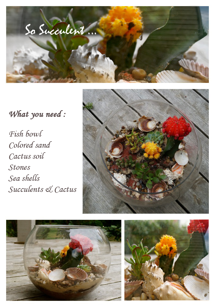 - Color and texture: Focus on adding different colors and textures by layering different colored sand, mud, stones, shells and succulents. If you want the green theme then try going for tone on tone greens with different textures. Add reds, yellows and oranges if you want it keep it more colorful.
